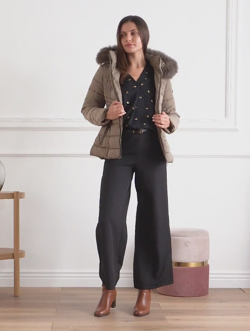 Doudoune droite à capuche en fourrure synthétique - Taupe