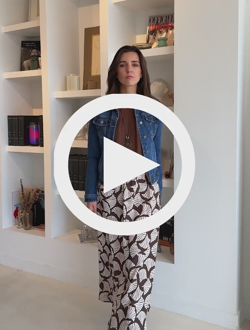 Jupe longue imprimé ginkgo à détail brodé - Marron